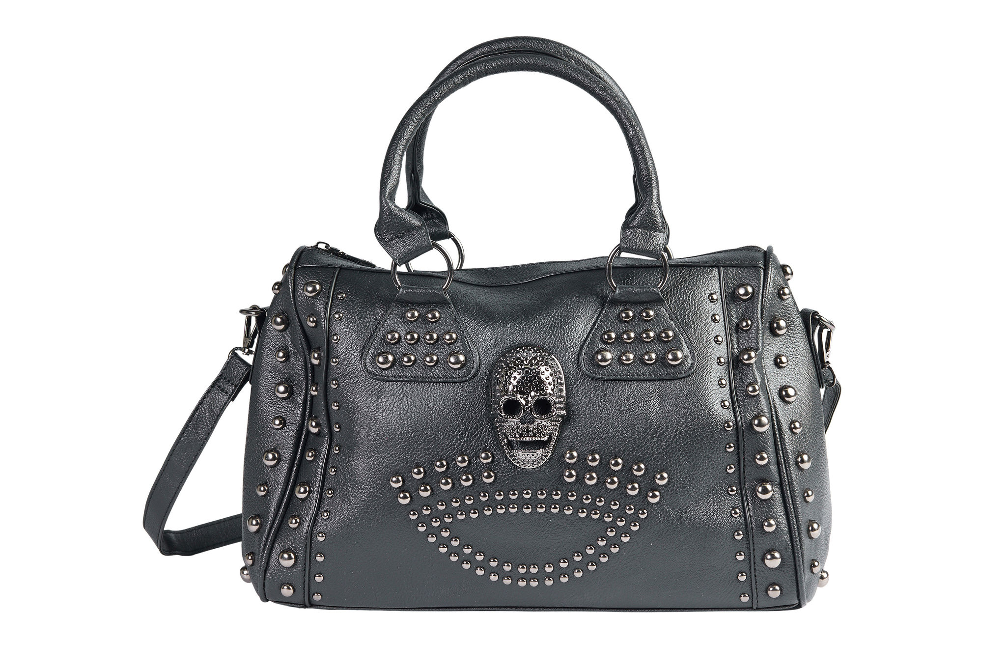 Embrace your inner rebel with this striking gothic studded skull bag! Crafted from soft faux leather in a sleek gray or pewter finish, this bag is a perfect blend of edgy gothic style and practical design.